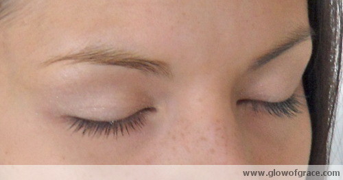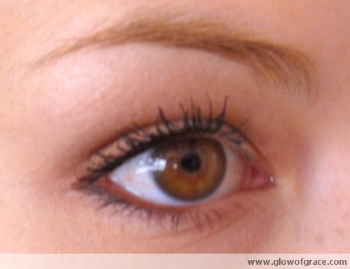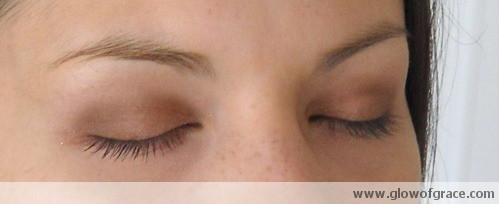To begin the eyes, sweep i-mark in biscotti all over the lid from the base of the eyelashes to underneath the brow. As you can see, it just adds a nice highlight and is not very pigmented.
