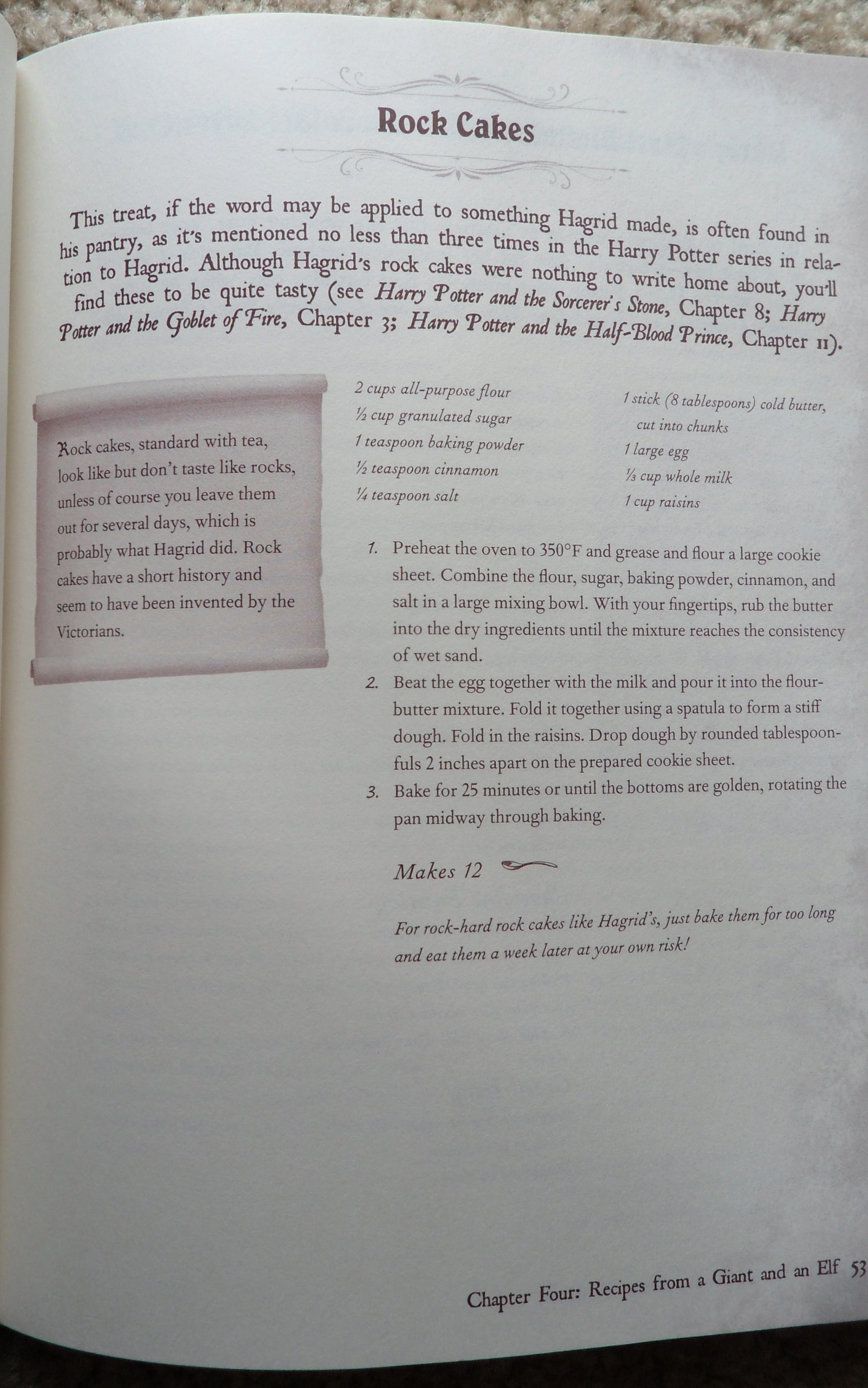 At the top of the page, Bucholz reminds readers where the Rock Cakes were mentioned in the books by providing a quick summary and citing the book(s) and chapter(s) in which they can be found. Off to the left in the little scroll, she gives a brief history on the cakes traditionally served with tea. Below the instructions, Dinah even tells you how to make them as Hagrid would…if you dare.