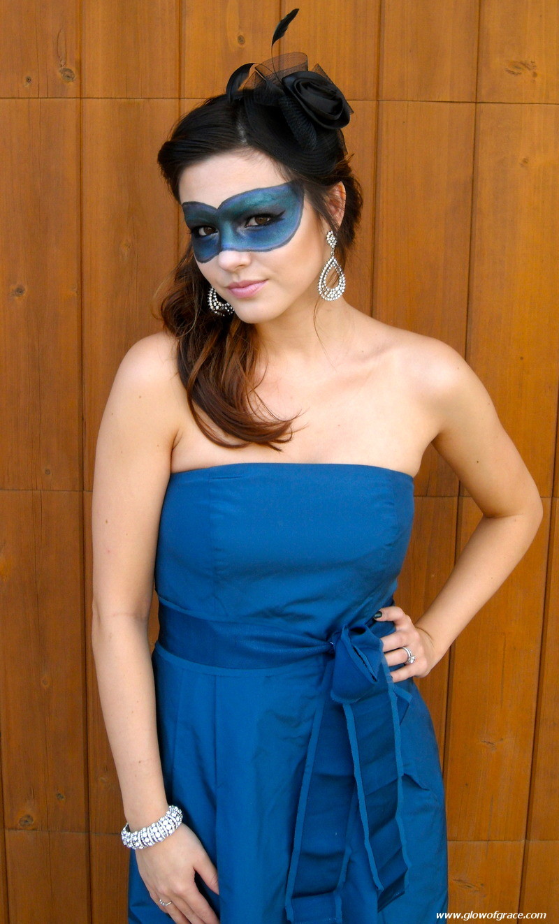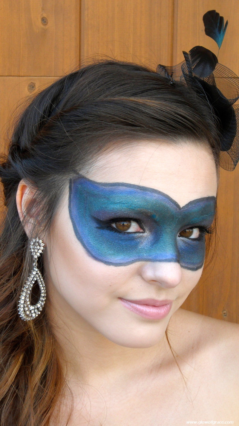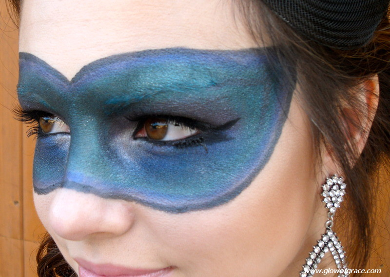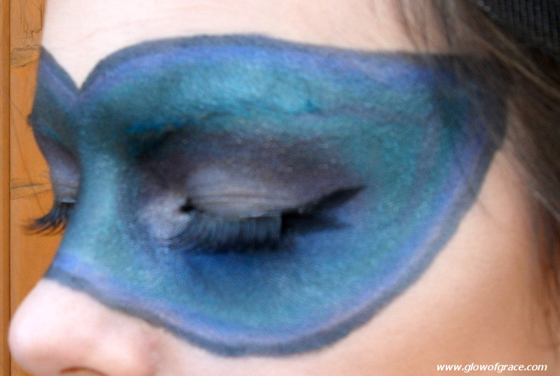 This mask with these particular colors will go with any blue, green, black or gray dress, but you can switch up the colors for a dress of a different color. Just keep the colors all cool or all warm so that they blend together really well to make a pretty “peacock feather” effect. Just play around with it, get creative and have fun!! If you’re unsure of how it will turn out, be sure to practice before Halloween.