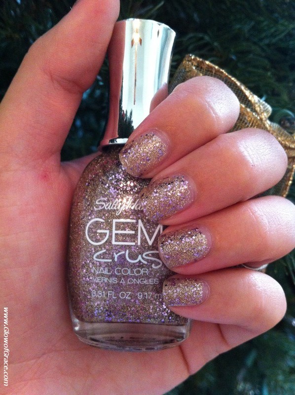 Hooray!! I’ve found another festive, holiday polish to wear this Christmas. I stumbled upon this polish as I wandered down the oh-so-dangerous nail polish aisle at Target, and was eager to put another glitter polish to the test. This one wears MUCH better. Thank goodness! Sally Hansen’s Gem Crush line has a range of glittery, shimmery colors. I opted for a gold toned shade to bring a little sparkle to my holiday outfits without being too overwhelming. Big Money is composed of a super fine gold glitter mixed with a chunkier rose gold glitter. This unique combination reads gold, rose gold or even silvery depending on the light.