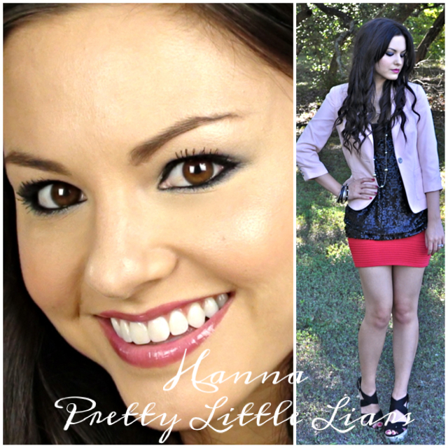 Hanna has such a trendy, girly style. She is the epitome of girly girl in her love for all things beauty, fashion, and bling, which made this look so fun to create. I must admit that part of the reason I love watching Pretty Little Liars is for the girls’ clothes and makeup, but do girls really dress like this in high school? I’m asking that seriously and with no judgement. I went to a private school for most of my educational life, so we had uniforms and on casual days we were allowed to wear jeans. I can tell you now that we were not strutting around in wedges and minis, although…come to think of it, I did share Hanna’s style in my first year of college. In I marched to the midwest, a California girl (and an OC girl at that) in her short skirts and high heels. When I unpacked my SEVEN suitcases into my 10X4 ft of personal space, my roommates stared at me like I was from another planet. But holy cow do I digress. Hanna wears by far the most makeup, and often pairs her smoky eyes with these messy curls. I hope y’all enjoy these tutorials!
