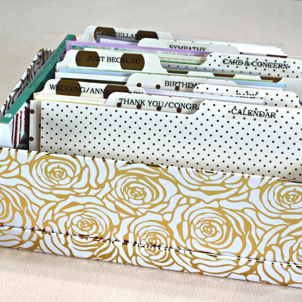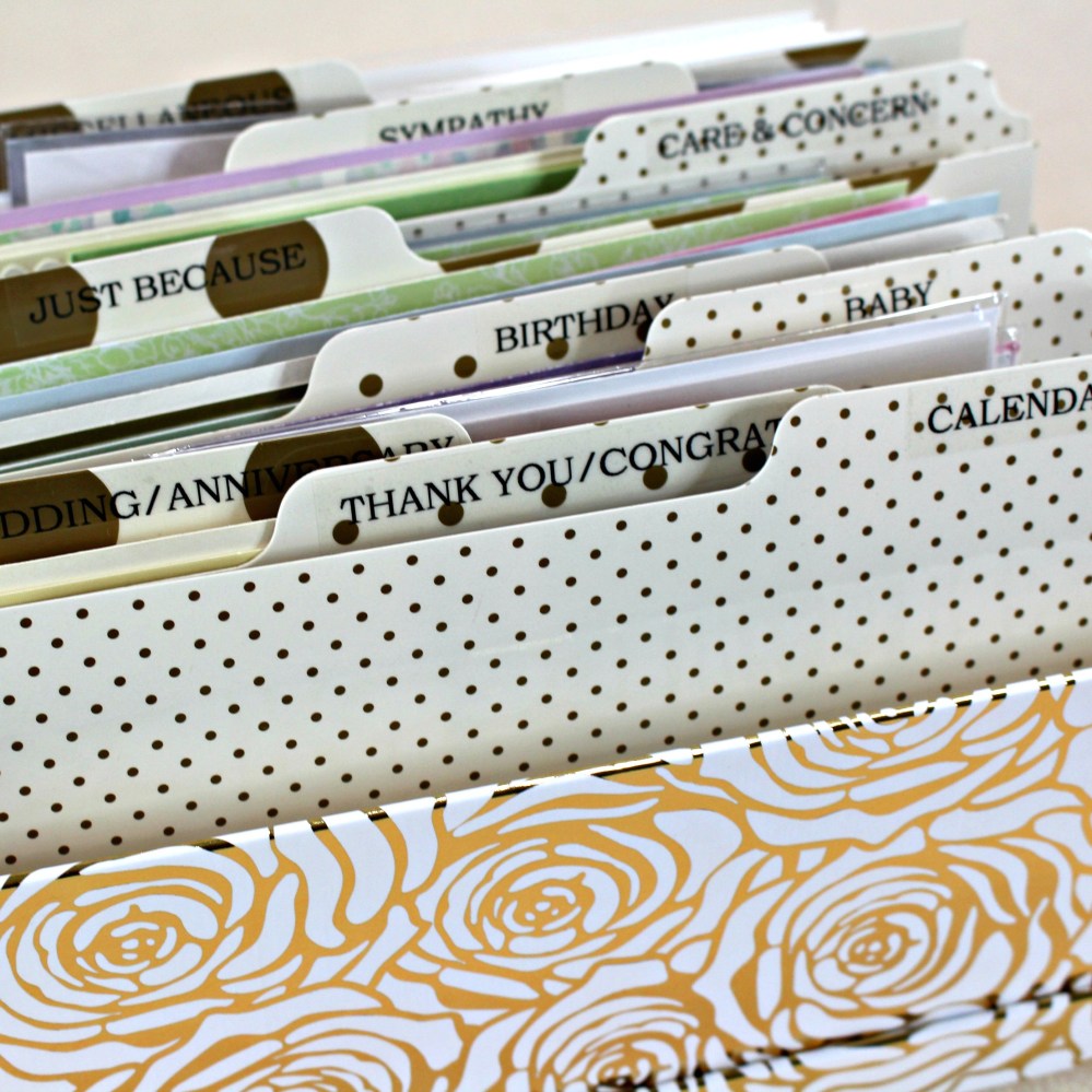 The divider tabs that I used were: Calendar, Thank You/Congrats, Wedding/Anniversary, Baby, Birthday, Just Because, Care & Concern, Sympathy, and Miscellaneous.